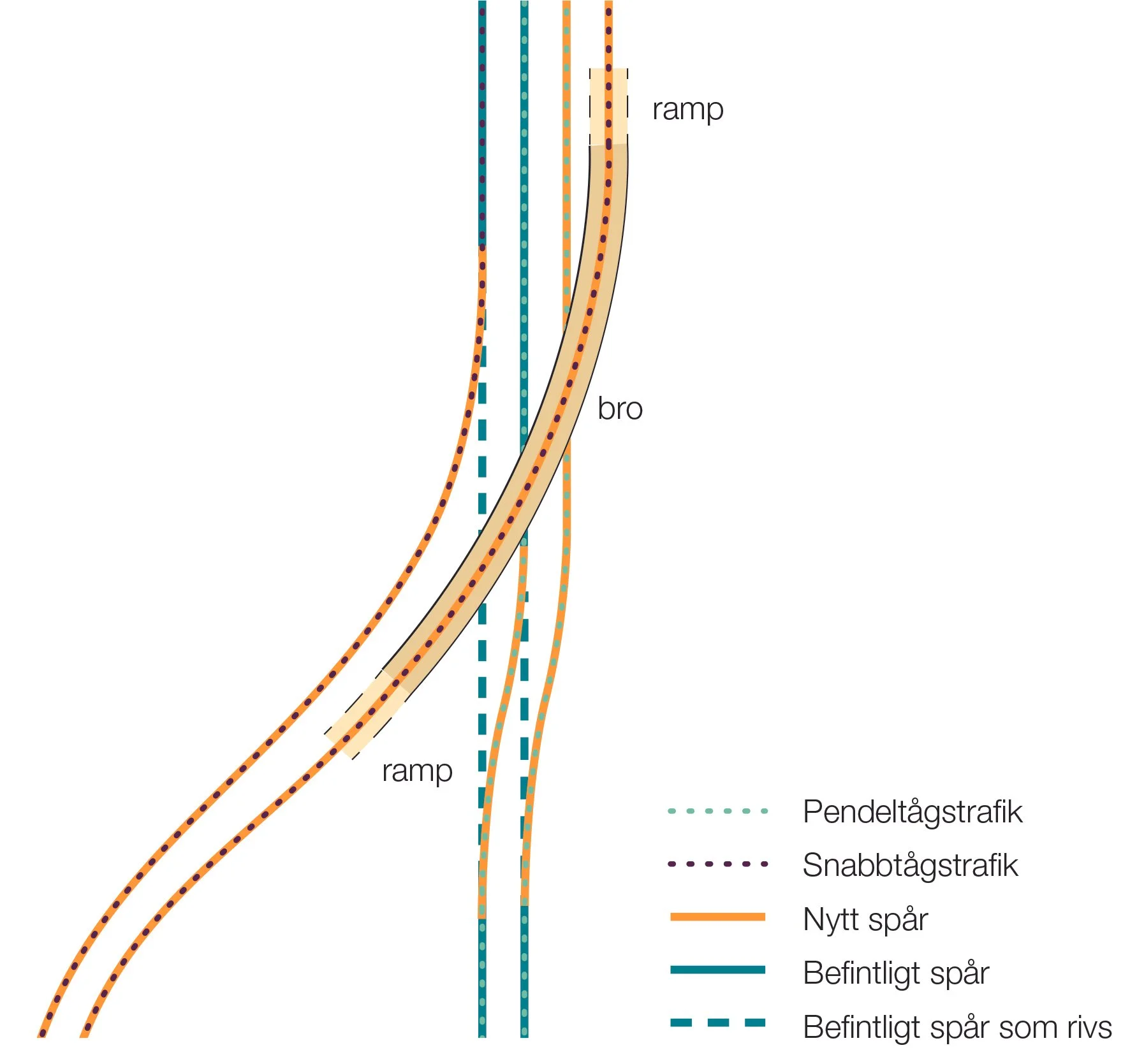 Illustrationen visar principen för hur nya spår skulle byggas i befintlig sträckning.
