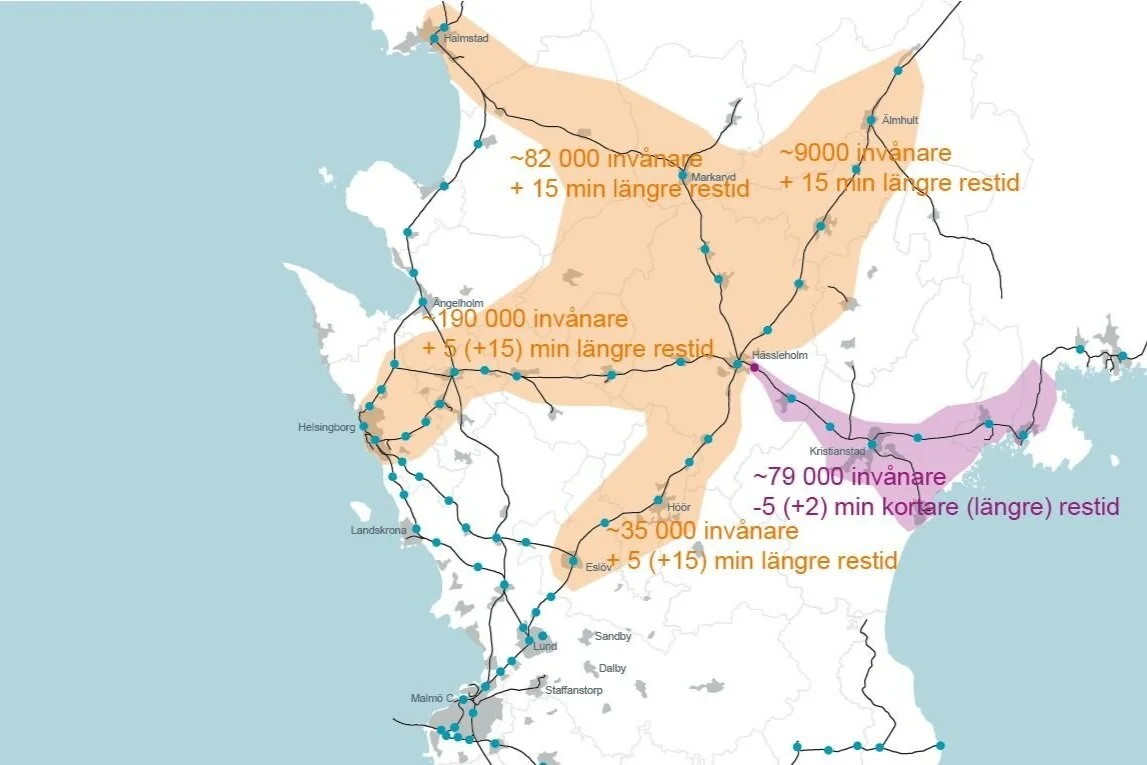 Illustrationen visar det samband som finns mellan de båda stationerna Lund och Hässleholm och hur resandemönster i Skåne kommer att påverkas av stationernas läge relativt varandra.
